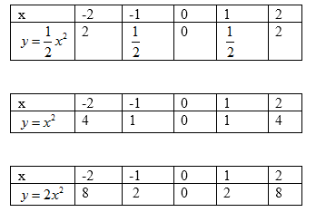 Cho ba hàm số \(y = \dfrac{1}{2}{x^2};\,\,y = {x^2};\,\,y = 2{x^2}\)
