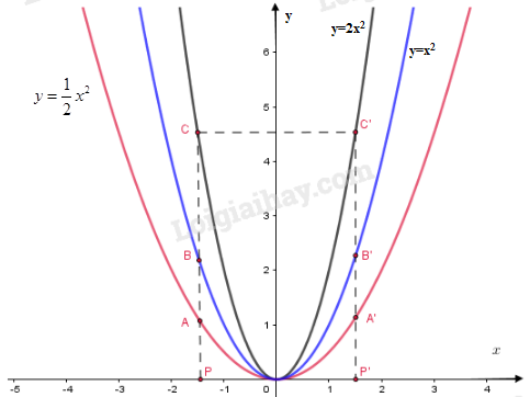 Xác định điểm P trên trục Ox có hoành độ \(x =  – 1,5\). Qua P kẻ đường thẳng song song với trục Oy, nó cắt các đồ thị \(y = \dfrac{1}{2}{x^2};y = {x^2};y = 2{x^2}\) lần lượt tại \(A;B;C\)