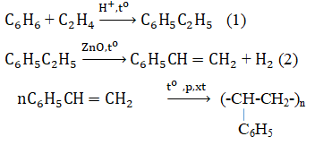 Từ các sản phẩm hóa dầu (C6H6 và CH2=CH2) có thể tổng hợp được polistiren, chất được dùng sản xuất nhựa trao đổi ion. Hãy viết phương trình hóa học của phản ứng xảy ra (có thể dùng thêm các hợp chất vô cơ cần thiết).