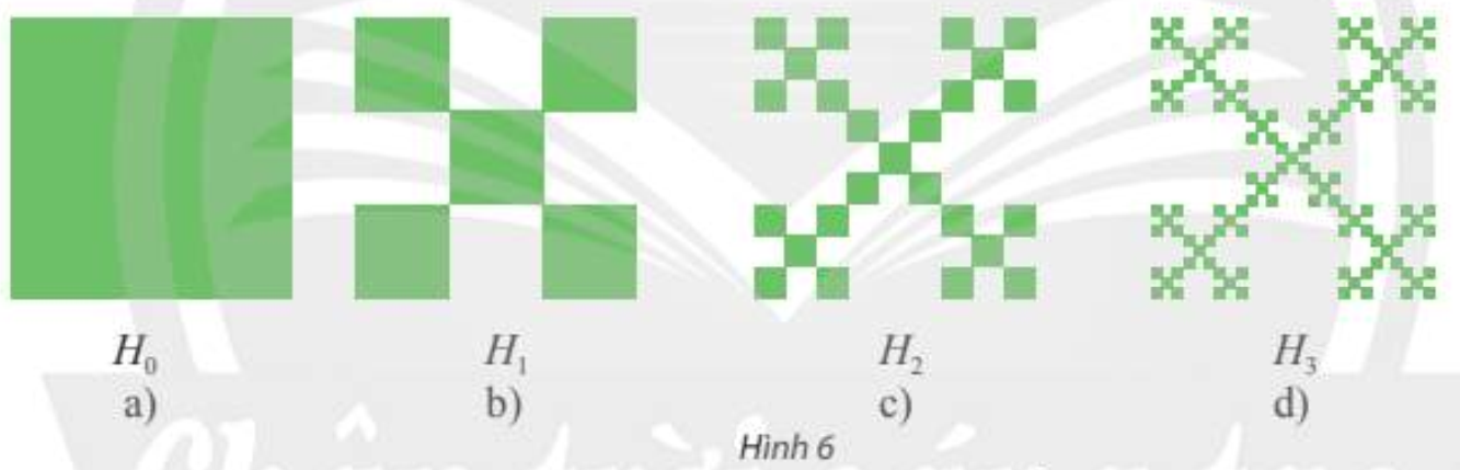 Bắt đầu bằng một hình vuông \({H_0}\) cạnh bằng 1 đơn vị độ dài (xem Hình 6a). Chia hình vuông \({H_0}\) thành chính hình vuông bằng nhau, bỏ đi bốn hình vuông, nhận được hình \({H_1}\) (xem Hình 6b). Tiếp theo, chia mỗi hình vuông của \({H_1}\) thành chín hình vuông, rồi bỏ đi bốn hình vuông, nhận được hình \({H_2}\) (xem Hình 6c). Tiếp tục quá trình này, ta nhận được một dãy hình \({H_n}\left( {n = 1,2,3,…} \right)\).