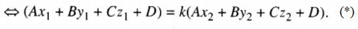 \( \Rightarrow A\left( {{{{x_1} – k{x_2}} \over {1 – k}}} \right) + B\left( {{{{y_1} – k{y_2}} \over {1 – k}}} \right) + C\left( {{{{z_1} – k{z_2}} \over {1 – k}}} \right) + D = 0\)