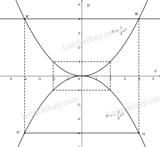 b) Tìm trên đồ thị của hàm số \(\displaystyle y =  – {1 \over 4}{x^2}\) điểm N có cùng hoành độ với M, điểm N’ có cùng hoành độ với M’. Đường thẳng NN’ có song song với Ox không? Vì sao? Tìm tung độ của N và N’ bằng hai cách: