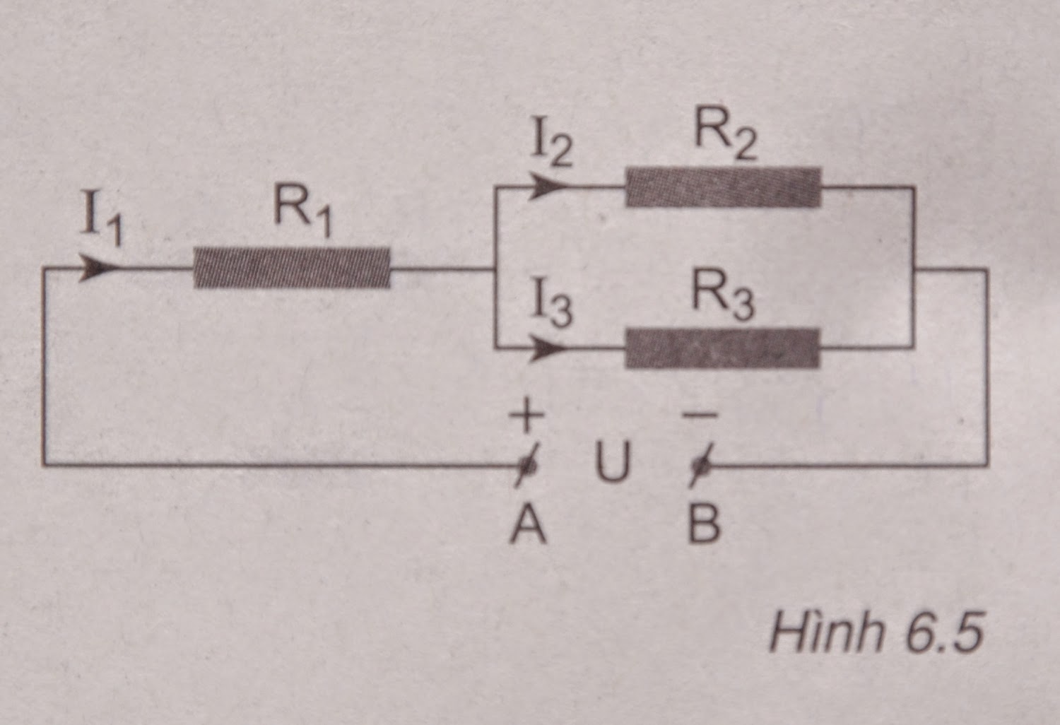 Cho mạch điện có sơ đồ như hình 6.5, trong đó có các điện trở R1=9Ω; R2=15Ω; R3=10Ω; dòng điện đi qua R3 có cường độ là I3=0,3A.