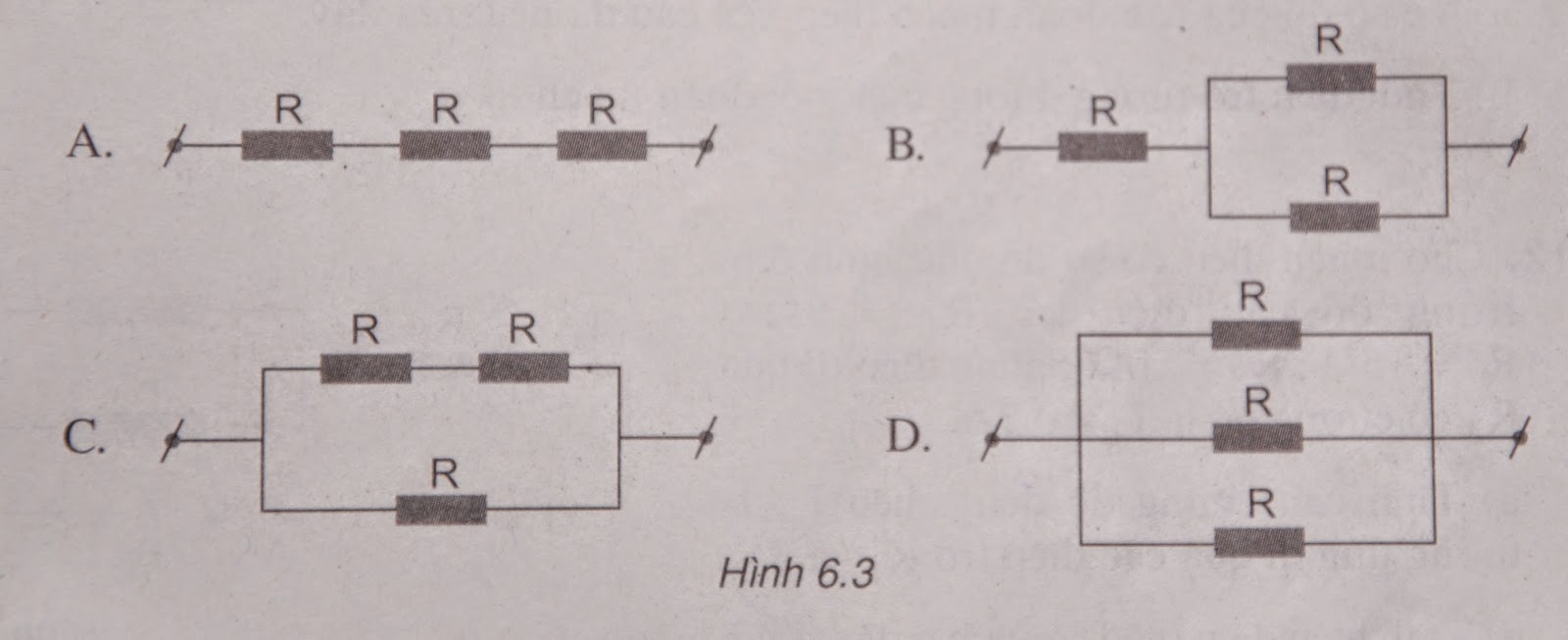 Các điện trở R là như nhau trong các đoạn mạch có sơ đồ trong hình 6.3 dưới đây. Hỏi điện trở tương đương của đoạn mạch nào là nhỏ nhất?
