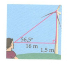 Khoảng cách từ tâm của cánh quạt đến mặt đất là \(h = 1,5 + 16.\tan 56,{5^o} \approx 25,67\) m