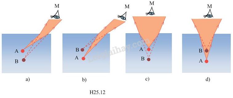 Một hòn sỏi nhỏ đặtt ại vị trí A trong nước. Mắt đặt trong không khí tại vị trí M nhìn thấy hình ảnh hòn sỏi trong nwuocs tại vị trí B. Các hình H25.12 mô tả đường đi của chùm tia sáng từ hòn sỏi đến mắt. Hình nào mô tả đúng đường đi của các tia sáng ?