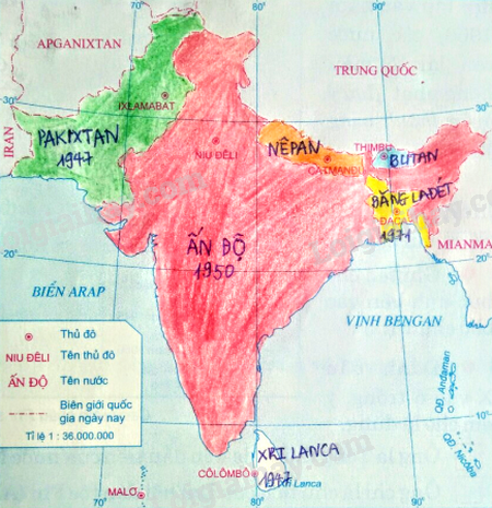 c) Cho biết, Ấn Độ trước năm 1947 gồm những nước nào trên bản đồ ngày nay?
