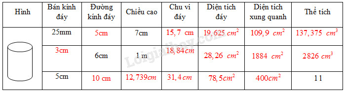 – Thể tích \(V = \pi {r^2}h \approx 3,14.2,{5^2}.7 \)\(\approx 137,375\left( {c{m^3}} \right)\)