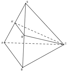 Ta có: \(\displaystyle{{{V_{S.A’B’C}}} \over {{V_{S.ABC}}}} = {{SA’} \over {SA}}.{{SB’} \over {SB}}.{{SC} \over {SC}} = {1 \over 2}.{1 \over 2}.1 = {1 \over 4}\)
