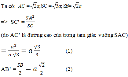 Ta có \(AC’\) là đường cao trong tam giác vuông \(SAC\) nên \({{SC’} \over {SC}} = {{SC’.SC} \over {S{C^2}}} = {{S{A^2}} \over {S{C^2}}} = {{{a^2}} \over {3{a^2}}} = {1 \over 3}\)