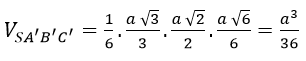 Vì \({V_{S.ABC}} = {{{a^3}} \over 6}\) nên \({V_{S.AB’C’}} = {{{a^3}} \over {36}}\).
