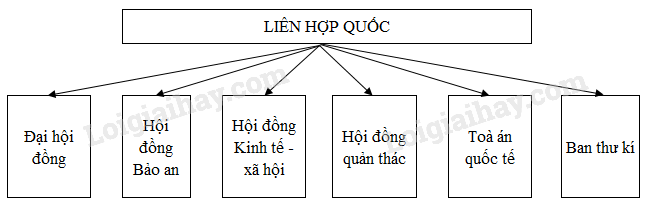 Dựa vào mục II của Bài 1 trong SGK, em hãy vẽ sơ đồ 6 cơ quan chính của Liên hợp quốc: Đại hội đồng, Hội đồng Bảo an, Hội đồng Kinh tế- xã hội, Hội đồng Quản thác, Toàn án Quốc tế, Ban Thư kí.