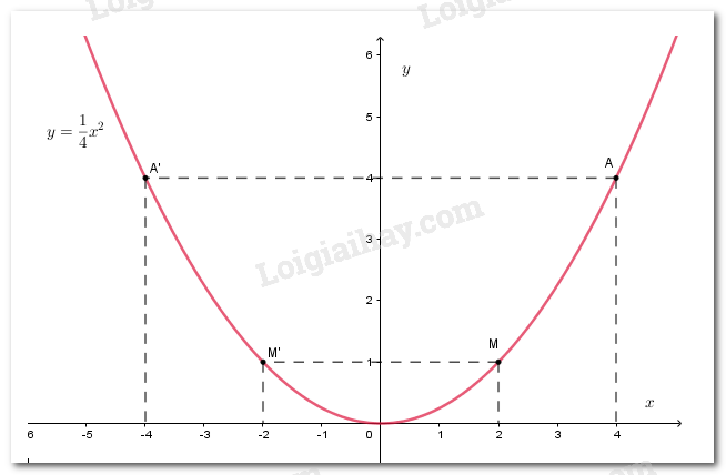 Từ đó ta vẽ đồ thị đi qua 5 điểm \(A;M;O;M’;A’\)  ta được đồ thị \(y = \dfrac{1}{4}{x^2}.\)