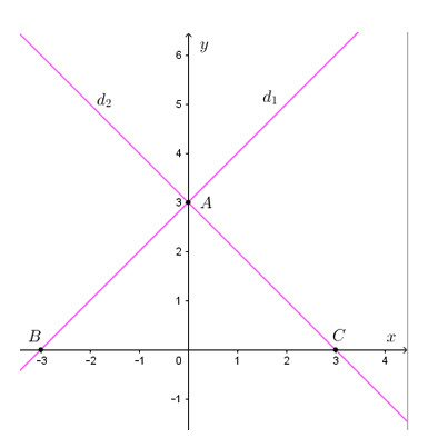 \(\left( {{d_1}} \right) \cap Ox = B\left( { – 3;0} \right);\)\(\,\,\left( {{d_2}} \right) \cap Ox = C\left( {3;0} \right)\)