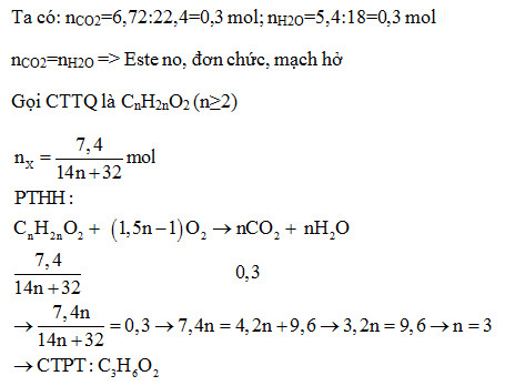 – Từ số mol của CO2 và nước \( \Rightarrow \) este no, đơn chức mạch hở \( \Rightarrow \)Công thức tổng quát của este