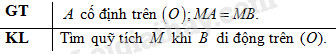 Kẻ đường kính \(AC;\) kẻ dây \(AB\); nối \(MO.\) Các điểm \(A\) và \(O\) cố định. Khi đó, ta có : \(MA = MB\) và \(MO \bot AB\) vì đường kính đi qua trung điểm của dây không đi qua tâm thì vuông góc dây đó.