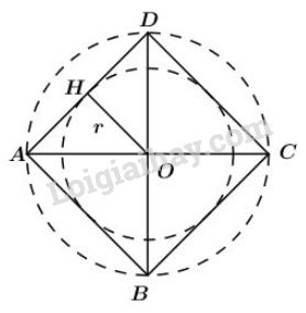 Khi đó ta có \(OH\) là bán kính \(r\) của đường tròn nội tiếp hình vuông \(ABCD.\) Vì \(AB = BC = CD = DA\) ( ABCD là hình vuông) nên khoảng cách từ tâm O đến AB, BC, CD, DA bằng nhau và cùng bằng OH ( định lý liên hệ giữa dây cung và khoảng cách từ tâm đến dây)