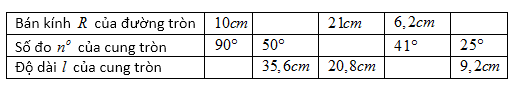 + Với \(n^\circ  = 25^\circ ;l = 9,2cm\) thì bán kính của đường tròn là \(R = \dfrac{{180l}}{{\pi n}} = \dfrac{{180.9,2}}{{\pi .25}} \approx 21,1cm\)