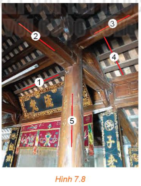 Đối với nhà gỗ truyền thống, trong các cấu kiện: hoành, quá giang, xà cái, rui, cột tương ứng được đánh số 1, 2, 3, 4, 5 như trong Hình 7.8, những cặp cấu kiện nào vuông góc với nhau?