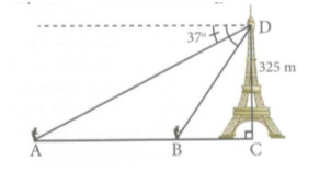 Một người đứng trên đỉnh tháp cao 325 m nhìn thấy hai điểm A và B với hai góc hạ lần lượt là \({37^o}\) và \({72^o}\). Tính khoảng cách AB.