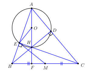 \( \Rightarrow \) 4 điểm \(A,\,\,D,\,\,H,\,\,E\) cùng thuộc đừng tròn đường kính AH, O là tâm của đường tròn đường kính AH \( \Rightarrow O\) là trung điểm của \(AH\).