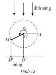 Thanh OM quay ngược chiều kim đồng hồ quanh trục O của nó trên một mặt phẳng thẳng đứng và in bóng vuông góc xuống mặt đất như Hình 12. Vị trí ban đầu của thanh là OA. Hỏi độ dài bóng O’M’ của OM khi thanh quay được \(3\frac{1}{{10}}\) vòng là bao nhiêu, biết thanh độ dài OM là 15cm? Kết quả làm trong đến hàng phần mười.