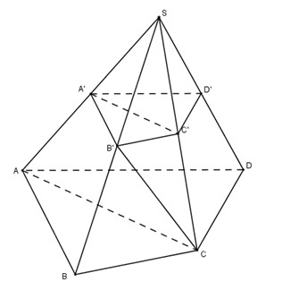 \( \Rightarrow {V_{S.A’B’C’D’}} = {V_{S.A’B’C’}} + {V_{S.A’C’D’}} \) \(= \dfrac{1}{{16}}.{V_{S.ABCD}} + \dfrac{1}{{16}}.{V_{S.ABCD}} = {\dfrac{1}{8}.{V_{S.ABCD}}}\)