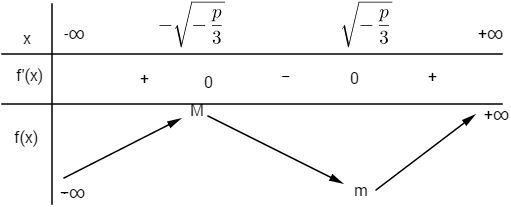 \(f’\left( x \right) = 0 \Leftrightarrow 3{x^2} + p = 0\,\,\left( 1 \right)\)