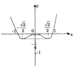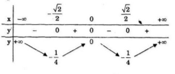 Hàm số đạt cực tiểu tại: \(x={{\sqrt 2 } \over 2}\) và \(x=-{{\sqrt 2 } \over 2}\); \(y\left( { \pm {{\sqrt 2 } \over 2}} \right) =  – {1 \over 4}\)