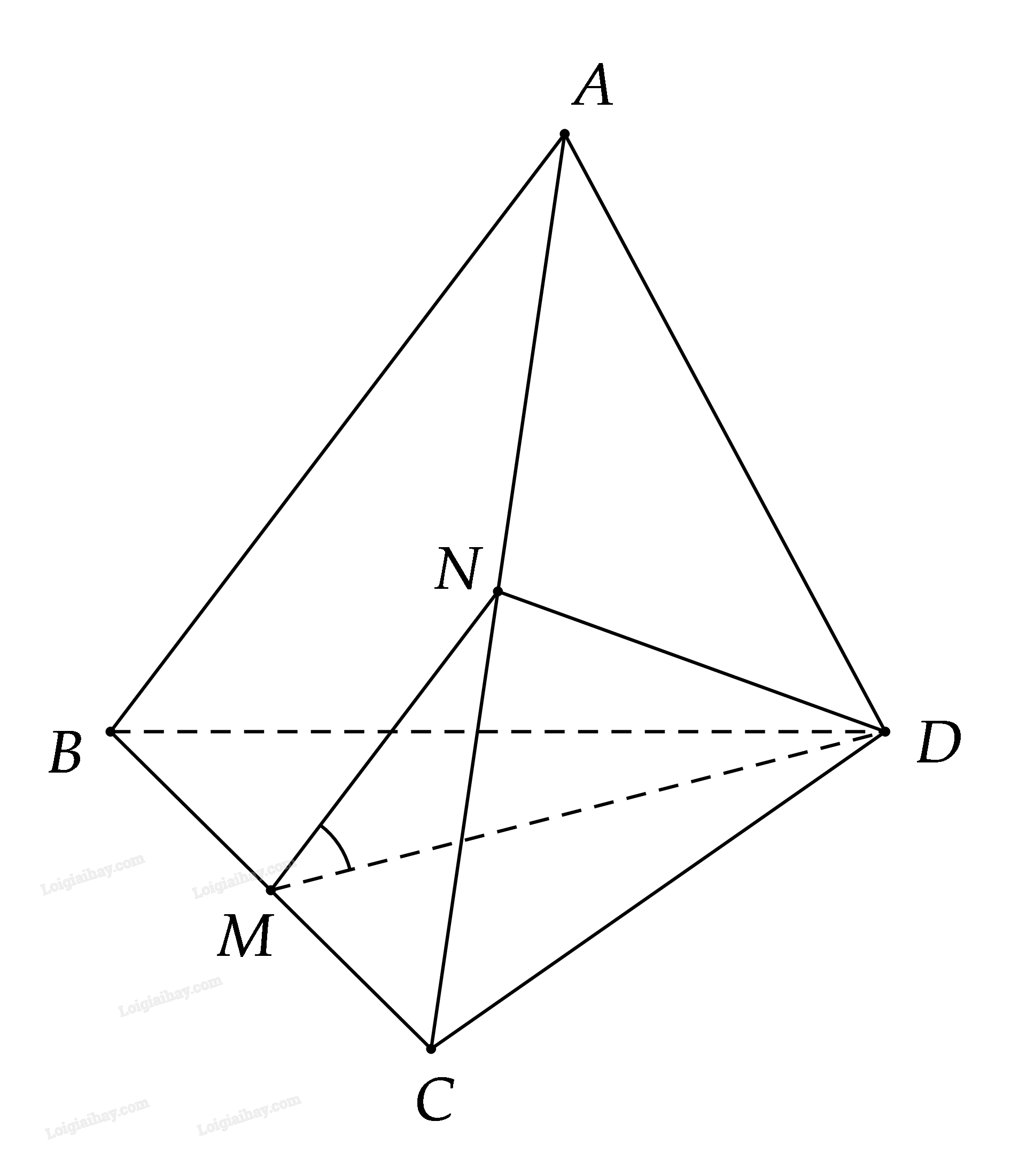 + Góc giữa \(\left( {AB,MD} \right) = \left( {MN,MD} \right)\)