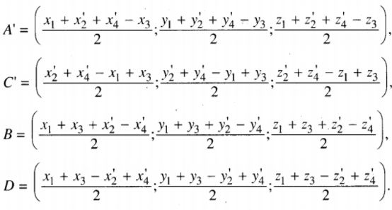 \(\eqalign{  & O = \left( {{{{x_1} + {x_3}} \over 2};{{{y_1} + {y_3}} \over 2};{{{z_1} + {z_3}} \over 2}} \right),  \cr  & O’ = \left( {{{x{‘_2} + x{‘_4}} \over 2};{{y{‘_2} + y{‘_4}} \over 2};{{z{‘_2} + z{‘_4}} \over 2}} \right) \cr} \)