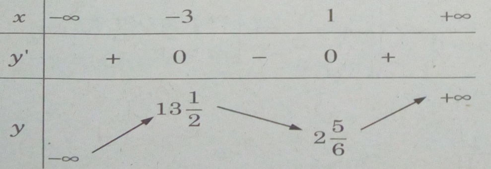 Hàm số đạt cực đại tại \(x =  – 3;{y_{CD}} = 13{1 \over 2};{y_{CT}} = 2{5 \over 6}\) khi x = 1
