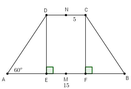 Cho hình thang cân ABCD có đáy lớn AB = 15 cm, đáy nhỏ CD = 5 cm và góc A bằng \({60^o}\).