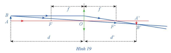 Một thấu kính hội tụ có tiêu cự là \(f\). Gọi \(d\) và \(d’\)  lần lượt là khoảng cách từ một vật thật AB và từ ảnh \(A’B’\) của nó tới quang tâm \(O\) của thấu kính như Hình 19. Công thức thấu kính là \(\frac{1}{d} + \frac{1}{{d’}} = \frac{1}{f}\).