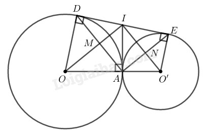 Cho hai đường tròn \((O)\) và \((O’)\) tiếp xúc ngoài tại \(A.\) Kẻ tiếp tuyến chung ngoài \(DE, D ∈ (O),\) \(E ∈ (O’).\)  Kẻ tiếp tuyến chung tại \(A,\) cắt \(DE\) ở \(I.\) Gọi \(M\) là giao điểm của \(OI\) và \(AD,\) \(N\) là giao điểm của \(O’I\) và \(AE.\)