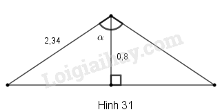 (h.31) Tính góc α tạo bởi hai mái nhà, biết rằng mỗi mái nhà dài 2,34m và cao 0,8m.