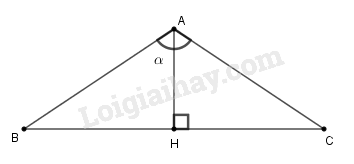 Hai mái nhà bằng nhau tạo thành hai cạnh AB, AC của một tam giác cân ABC (hình vẽ). Chiều cao AH của tam giác ABC cũng là đường phân giác của tam giác. Khi đó ta có: \(\widehat {BAH} = \dfrac{{\widehat {BAC}}}{2} = \dfrac{\alpha }{2}\)