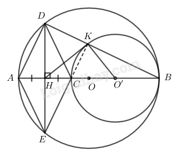\(c)\) Gọi \(K\) là giao điểm của \(DB\) và đường tròn \((O’).\) Chứng minh rằng ba điểm \(E, C, K\) thẳng hàng.