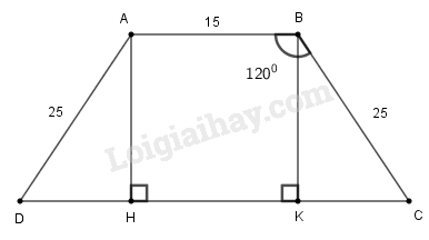 Giả sử hình thang \(ABCD\) có đáy nhỏ \(AB = 15cm\), cạnh bên \(AD = BC \)\(=25cm\), \(\widehat {ABC} = \widehat {BAD} = 120^\circ \).
