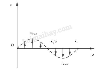 b) Vận tốc của các điểm trên dây phụ thuộc vị trí từng điểm. Hai điểm của dây ở cách đều một nút về hai phía luôn dao động ngược pha nhau. Khi đi qua vị trí cân bằng, các điểm có tốc độ lớn nhất (hình vẽ)