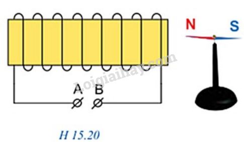Một ống dây dẫn nối với một nguồn điện không đổi tại hai đầu A, B. Một kim nam châm nằm cân bằng ở trước một đầu ống dây như hình H15.20. Hãy cho biết hai đầu A, B, đầu nào là cực dương, cực âm của nguồn điện?
