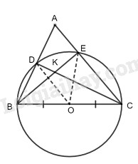 Cho tam giác nhọn \(ABC\). Vẽ đường tròn (O) có đường kính \(BC\), nó cắt các cạnh \(AB, AC\) theo thứ tự ở \(D, E.\)