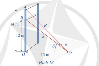 Một sợi cáp R được gắn vào một cột thẳng đứng ở vị trí cách mặt đất 14m. Một sợi cáp S khác cũng được gắn vào cột đó ở vị trí cách mặt đất 12m. Biết rằng hai sợi cáp trên cũng được gắn với mặt đất tại một vị trí cách chân cột 15m (Hình 18)