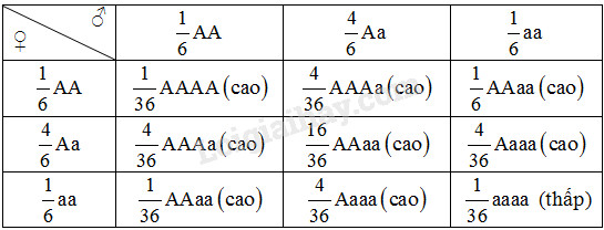 Tí lệ phân li kiểu gen ở F1: 1 AAAA: 8 AAAa: 18 AAaa: 8 Aaaa: 1 aaaa. Ti lệ phân li kiểu hình: 35 cao: 1 thấp.