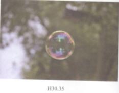 Thực hành: Dùng xà phòng hoặc bột giặt, nước rửa chén hòa tan với nước để tạo thành nước xà phòng. Dùng ống rỗng hẹp nhúng vào nước xà phòng rồi thổi vào đầu kia của ống để tạo ra các bong bóng xà phòng. Em hãy giải thích vì sao bong bóng xà phong lại có rất nhiều màu sắc sinh động. (hình H30.35).