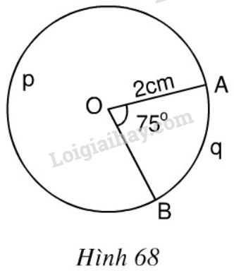 Trong hình 68, đường tròn tâm O có bán kính R = 2cm, góc AOB = 75^0.