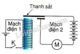 Khi đóng công tắc K để dòng điện chạy trong mạch điện 1 thì nam châm điện hút thanh sắt làm mạch điện 2 trở thành mạch kín. Khi đó có dòng điện chạy trong mạch điện 2 và động cơ M ở mạch 2 làm việc.