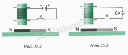 Làm lại thí nghiệm nhưng thay nguồn điện một chiều bằng nguồn xoay chiều 6V (hình 35.3). Hiện tượng xảy ra với thanh nam châm có gì khác so với trường hợp dùng nguồn điện một chiều ? Giải thích vì sao ?