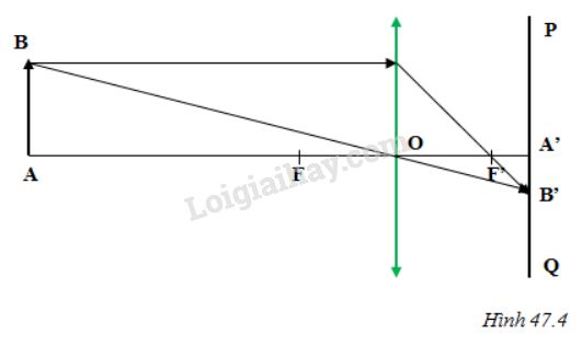 Vẽ ảnh của một vật có dạng một đoạn thẳng, đặt vuông góc với trục chính của vật kính (hình 47.4). Trong hình này: AB là vật, O là quang tâm của vật kính, PQ là vị trí đặt màn hứng ảnh, khoảng cách từ vật đến vật kính là 2m, từ màn hứng ảnh đến vật kính là 5cm. Hình vẽ không cần đúng tỉ lệ.
