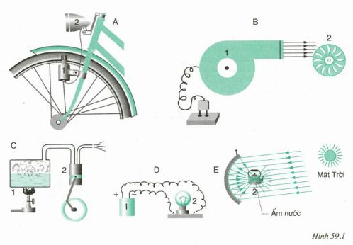 Trên hình 59.1 vẽ các thiết bị trong đó thực hiện sự biến đổi năng lượng từ dạng ban đầu sang dạng cuối cùng cần dùng cho con người. Hãy chỉ ra năng lượng đã được chuyển hóa từ dạng nào sang dạng nào qua các bộ phận (1), (2) của mỗi thiết bị. Điền vào chỗ trống tên của dạng năng lượng xuất hiện ở bộ phận đó.
